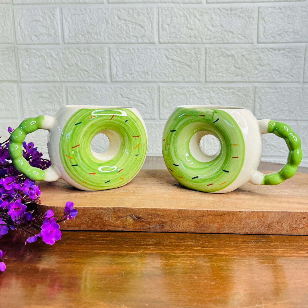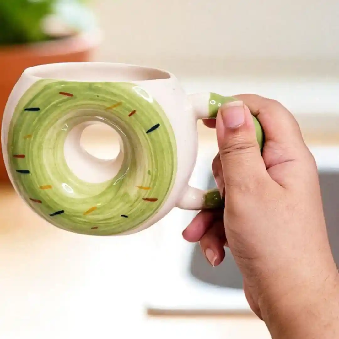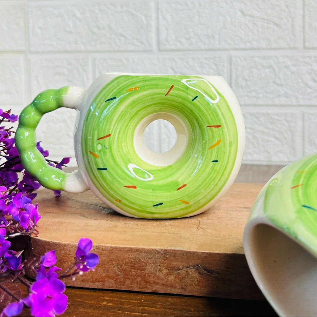 Fun and quirky handcrafted ceramic donut mugs with a green glaze and sprinkles design. These unique donut-shaped cups are microwave-safe, food-safe, and perfect for coffee lovers or as a playful gift.